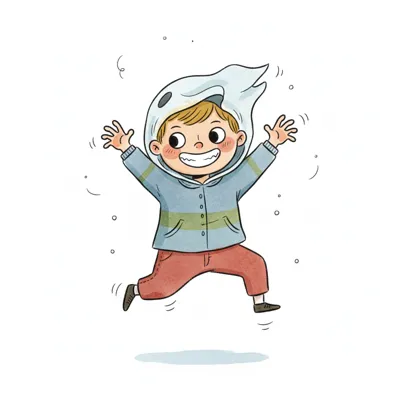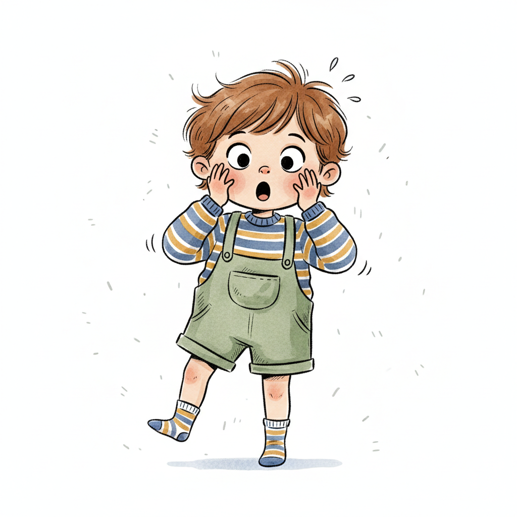 Niedliche, kindgerecht illustrierte Szene mit einem Kind oder einer Person als Hauptfigur, vor rein weißem Hintergrund, im frech-nordischen Aquarell-Skizzenstil. Klare, leicht wackelige Tuschekonturen, sichtbare Pinsel- und Strichtextur, dezente Schraffuren, weiche handgemalte Farbflächen in gedeckten Farben. Einfache, runde Formen. Keine harten Schatten, sondern sanfte, transparente Aquarellschichten. Leicht raue, handgezeichnete Linien statt glatter Vektorkanten. Subtile, vereinzelte Kritzelpunkte oder kleine Details im Hintergrund (wie Pünktchen oder feine Striche), aber keine echte Umgebung oder Landschaft. Die Figur ist mittig zentriert. Insgesamt charmant, humorvoll, warm und handgemacht wirkend. WICHTIG: Das Bild darf ABSOLUT KEINEN TEXT, KEINE BUCHSTABEN und KEINE ZAHLEN enthalten.