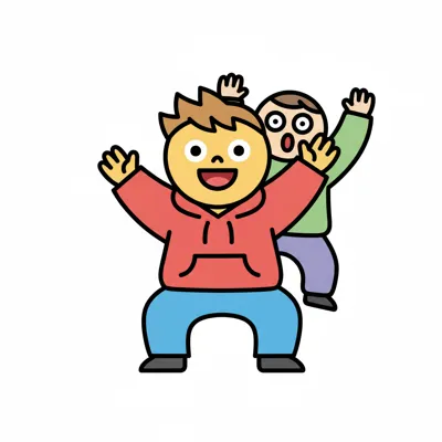 Zwei fröhliche Cartoon-Figuren mit erhobenen Armen, eine lachend, die andere überrascht.