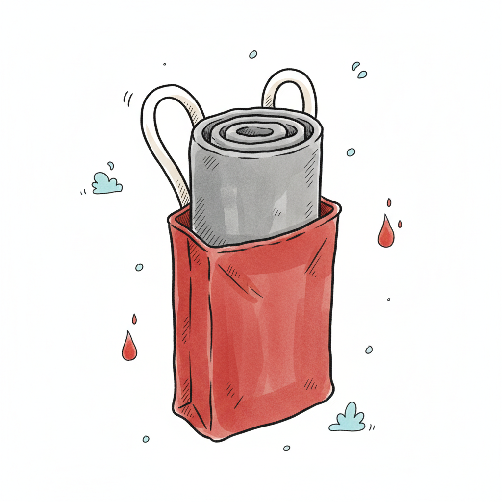 Roter Beutel mit gerolltem grauen Verband oder Manschette, umgeben von roten Tropfen und Wolken.