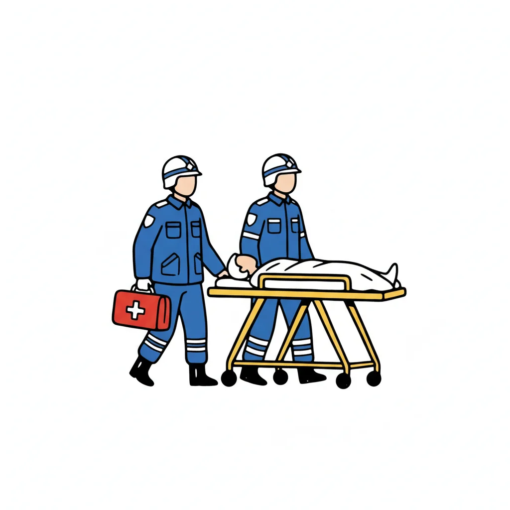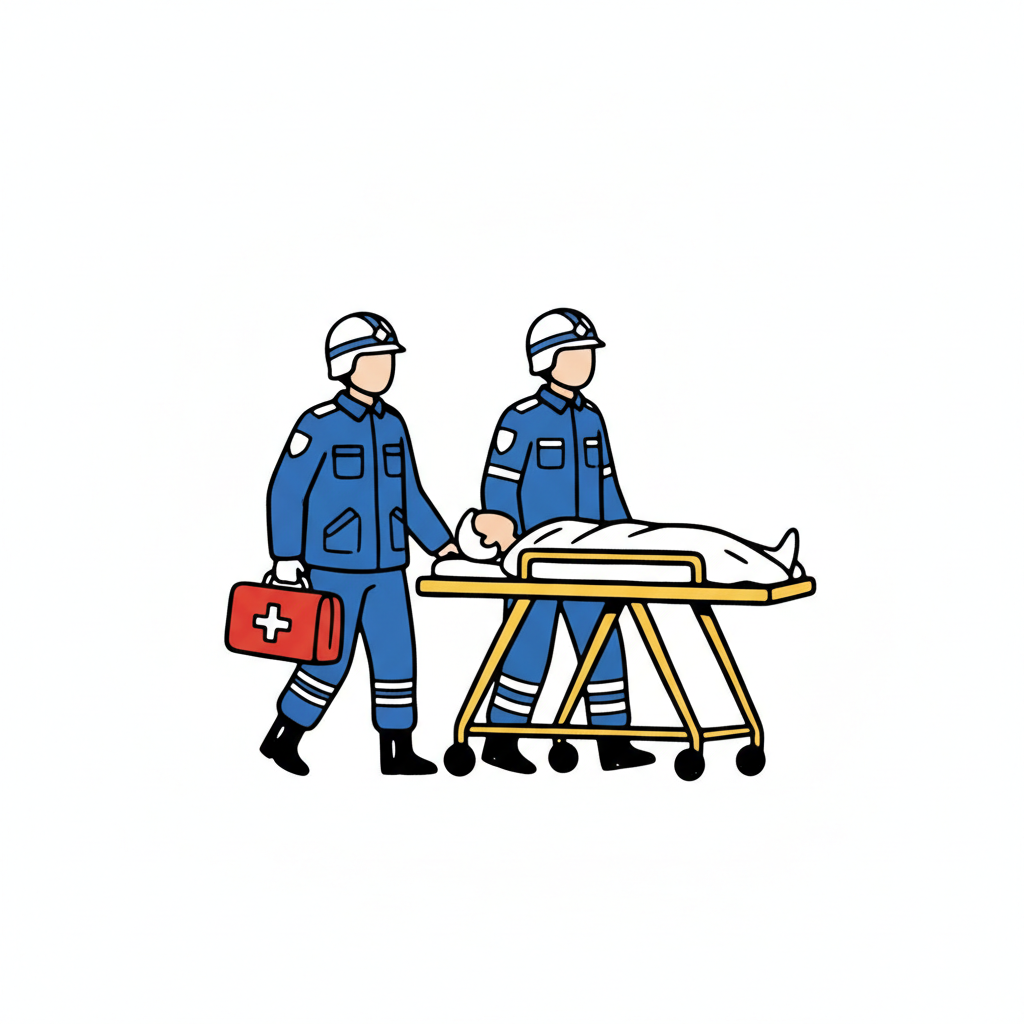 Zwei Rettungskräfte schieben eine Trage mit Patient, einer trägt einen Erste-Hilfe-Koffer.