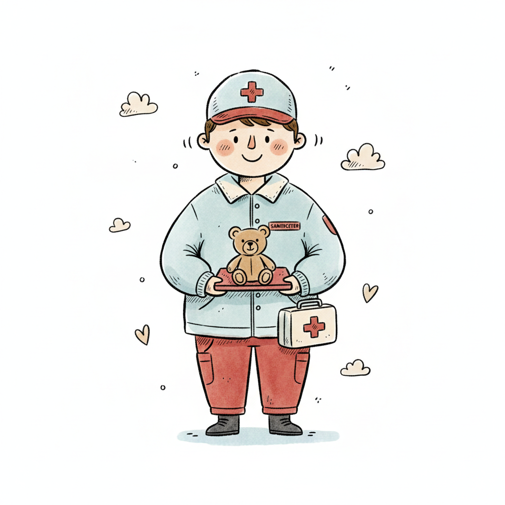 Freundlicher Sanitäter mit Teddybär und Erste-Hilfe-Koffer, bereit zu helfen.