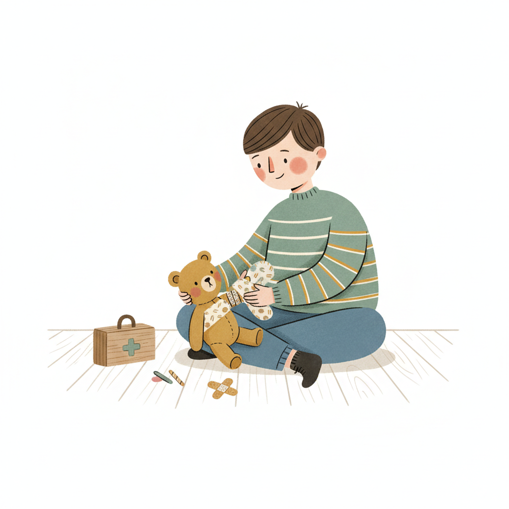 Ein Junge verarztet seine Teddybären mit Pflastern und einem Verbandskasten auf dem Boden.
