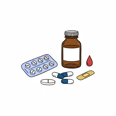 Illustration von Medikamenten: Pillen, Kapseln, Flasche, Pflaster und ein Blutstropfen.