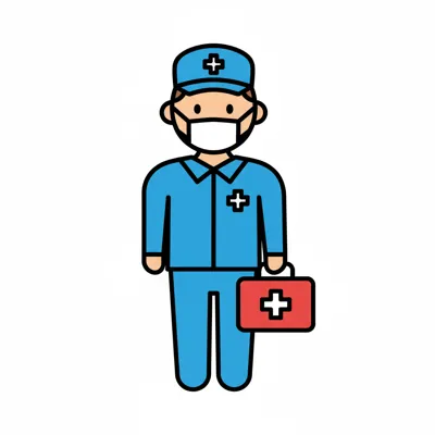 Illustration eines Sanitäters/Mediziners mit Maske, blauer Uniform und Erste-Hilfe-Koffer.