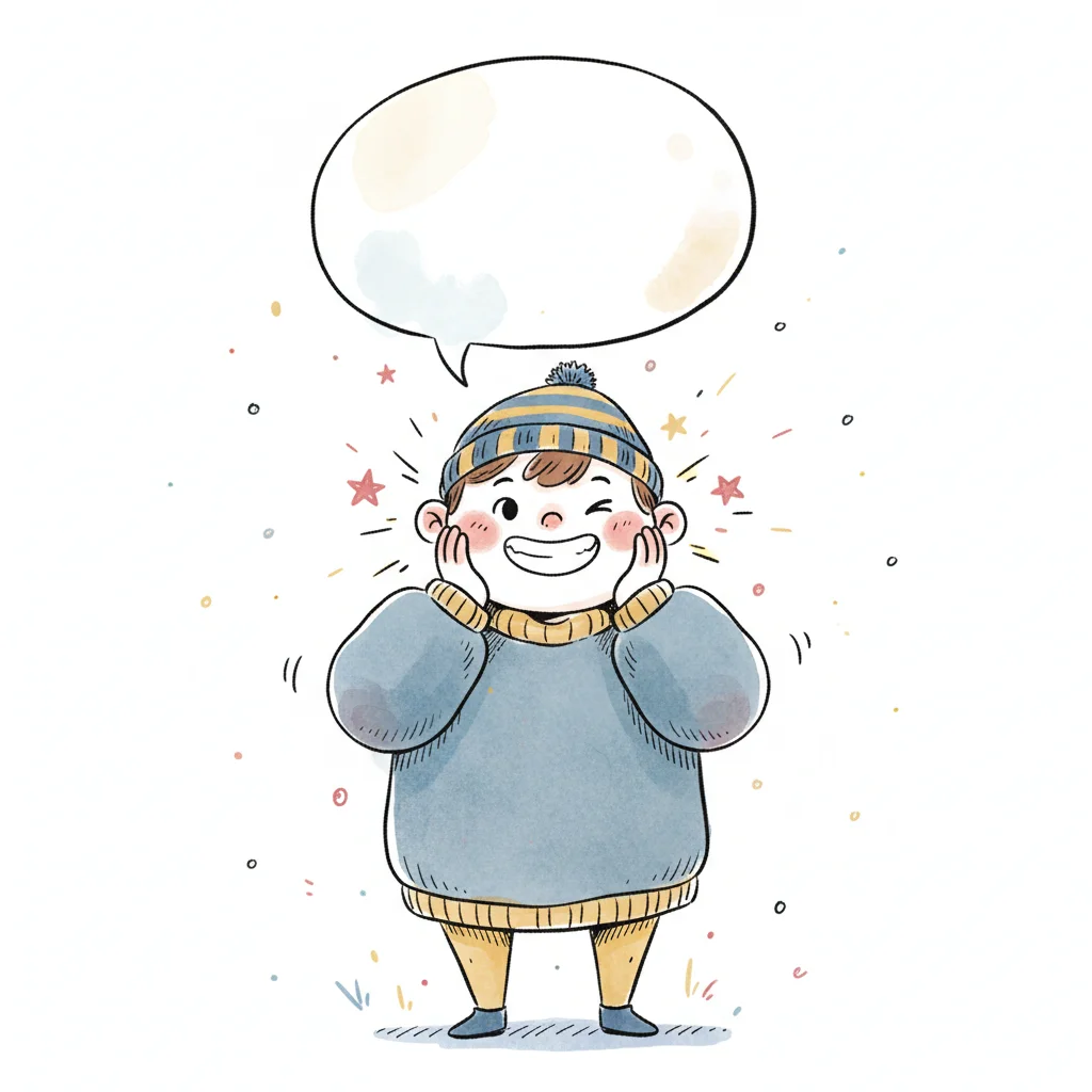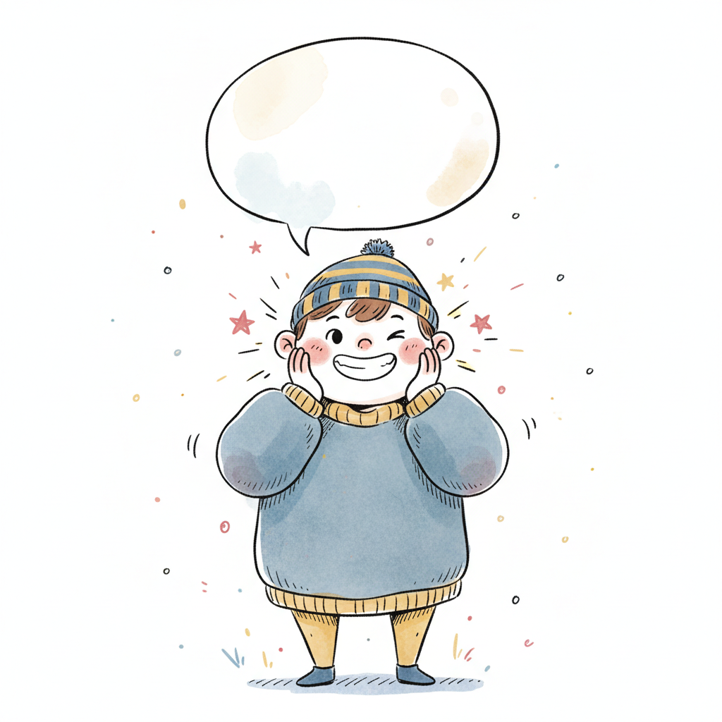 Ein fröhlicher Junge in dicker Kleidung mit Sprechblase.