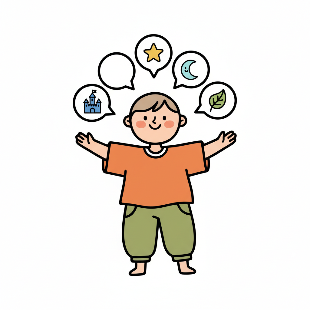 Ein Junge mit Sprechblasen zeigt auf Symbole von Fantasie und Natur.