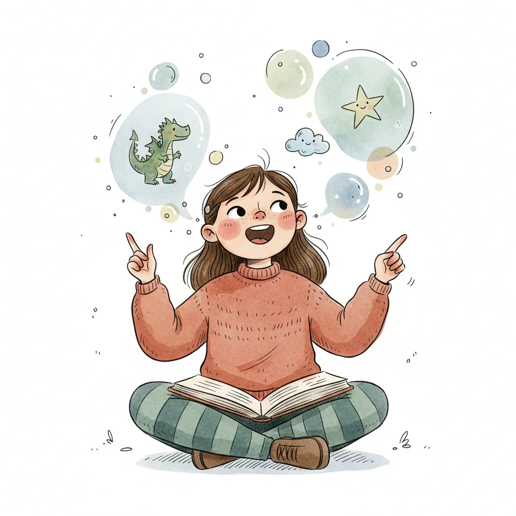 Ein Mädchen sitzt mit einem Buch und zeigt auf fantasievolle Blasen.