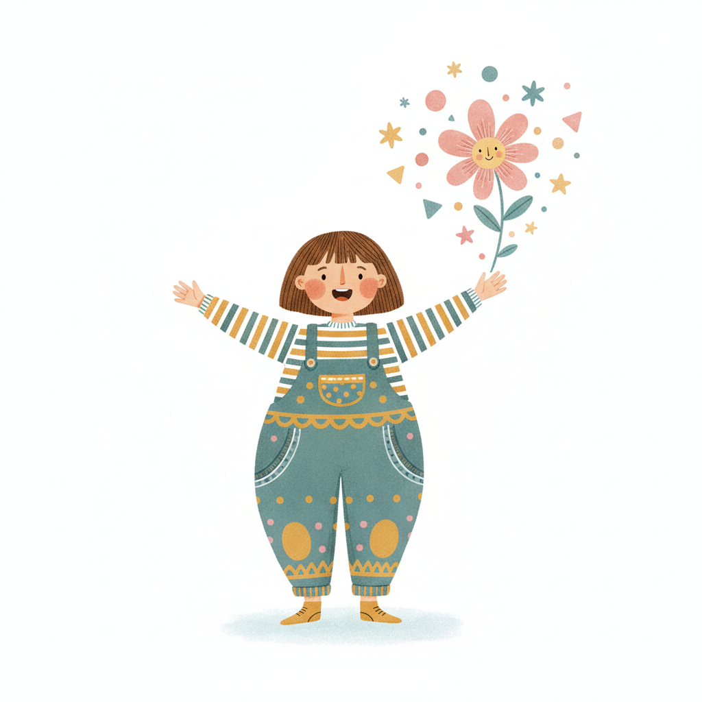 Fröhliches Cartoon-Mädchen in Latzhose hält lächelnde Blume mit bunten Formen.