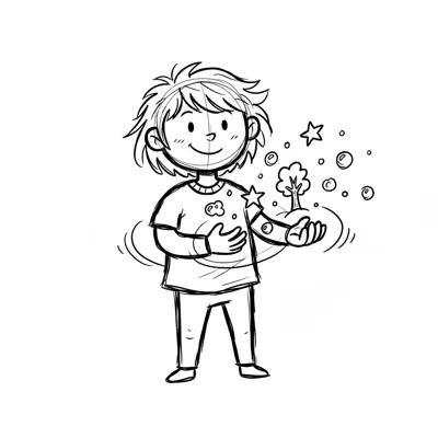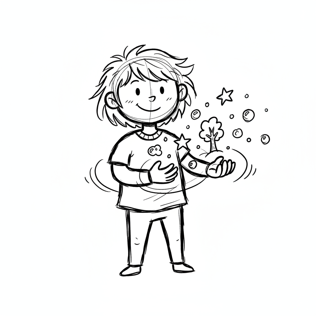 Ein lächelndes Kind hält einen Baum, Sterne und Blasen in den Händen, umgeben von Magie.