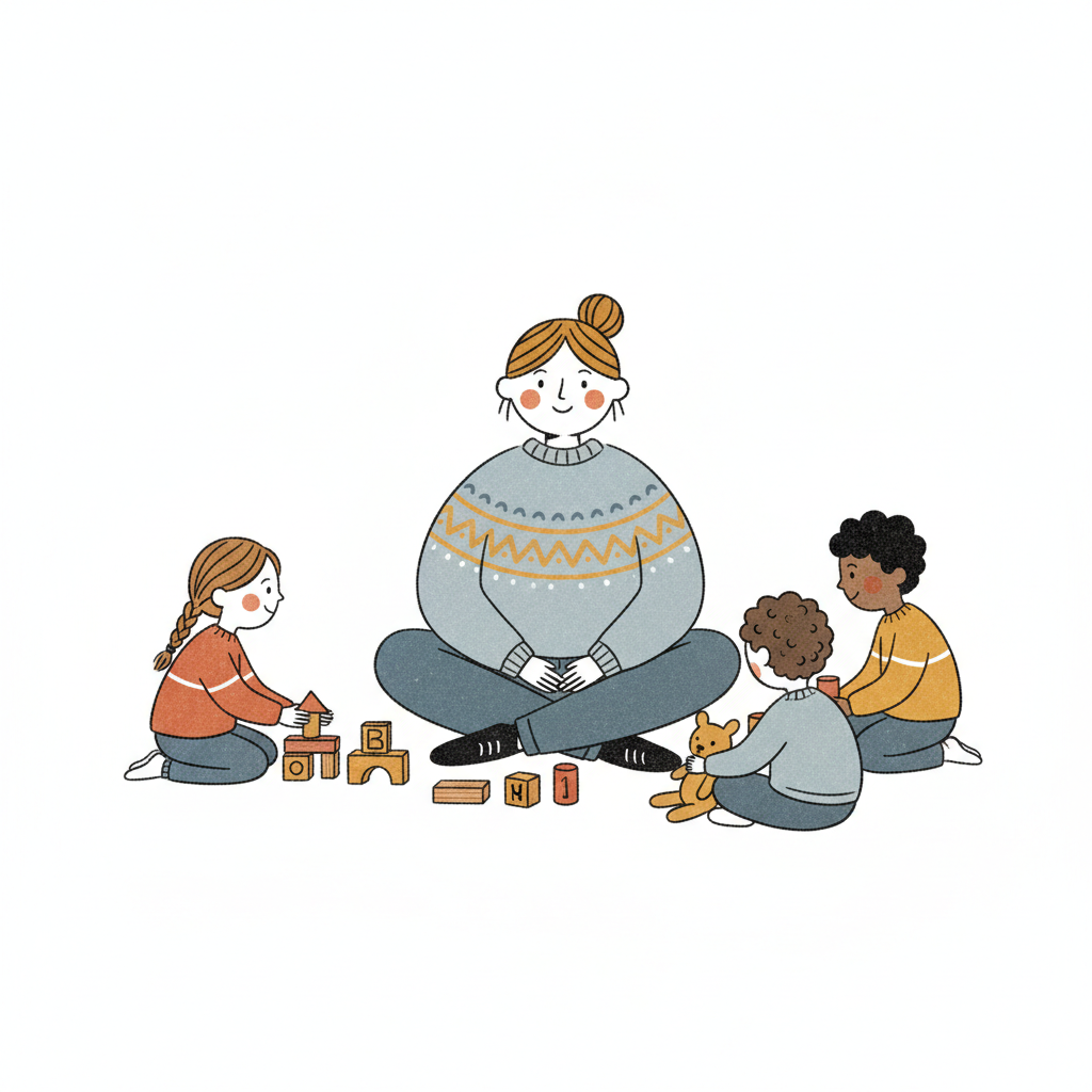 Eine Frau sitzt mit drei Kindern, die auf dem Boden mit Bauklötzen und Spielzeug spielen.