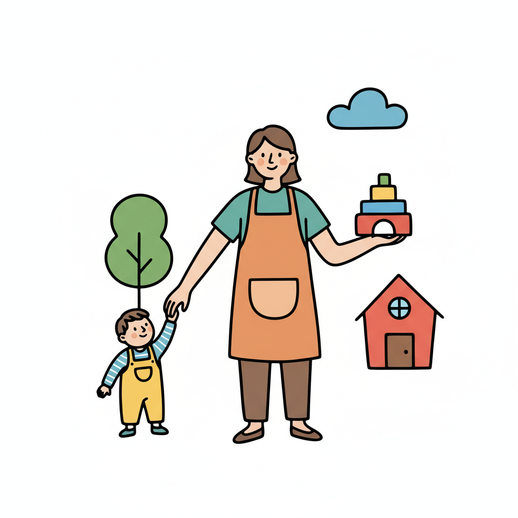 Eine Frau mit Schürze hält die Hand eines Kindes, umgeben von Spielzeug, Baum und Haus.