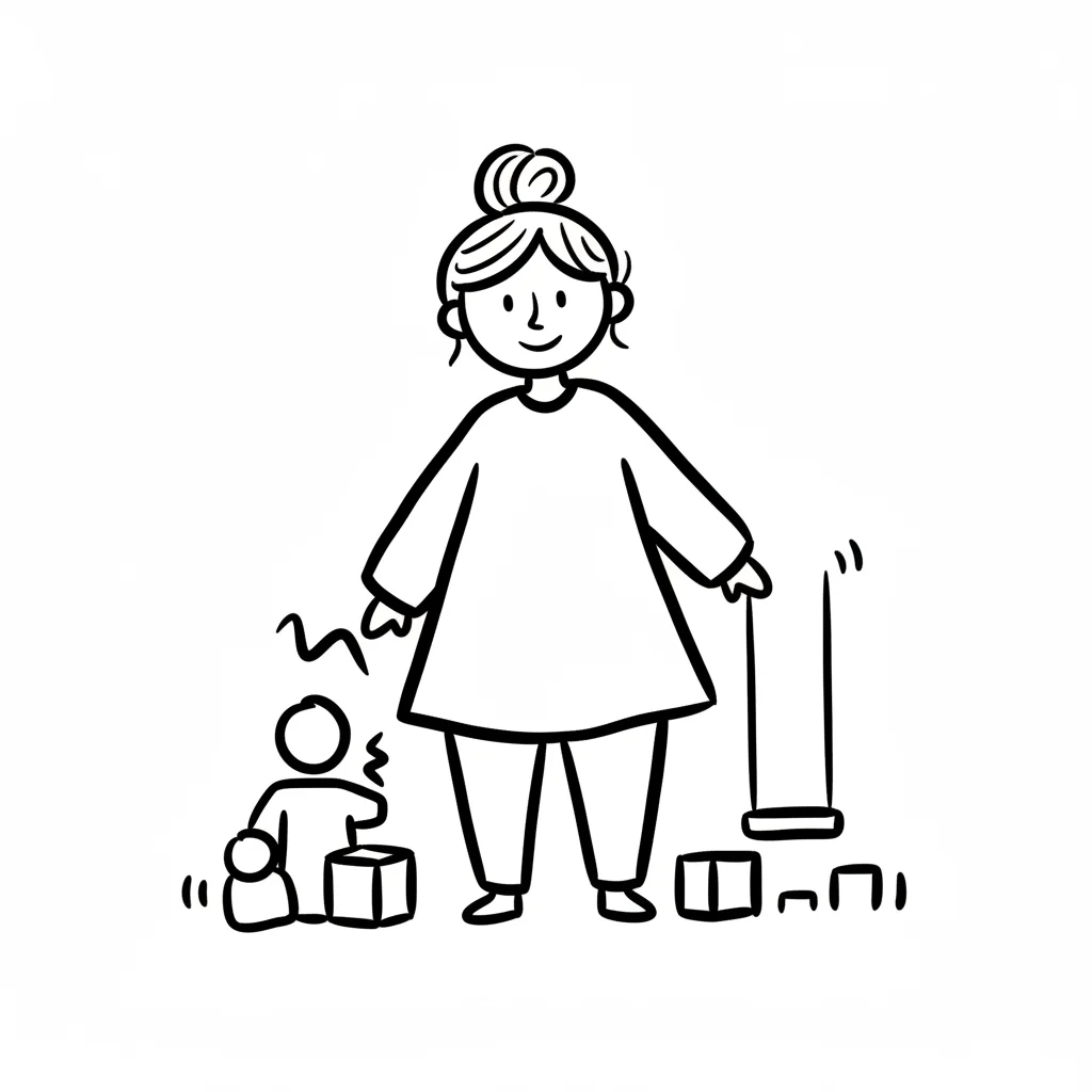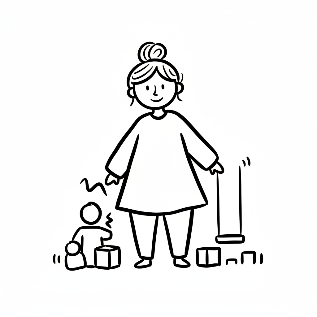 Einfache Strichzeichnung: lächelnde Frau mit Dutt, Kind spielt mit Bauklötzen, Seil.