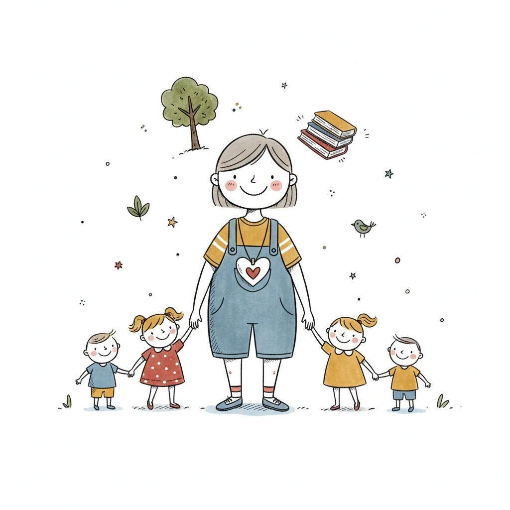 Glückliche Frau hält Händchen mit vier Kindern, umgeben von Büchern und Natur. Freundliche Illustration.