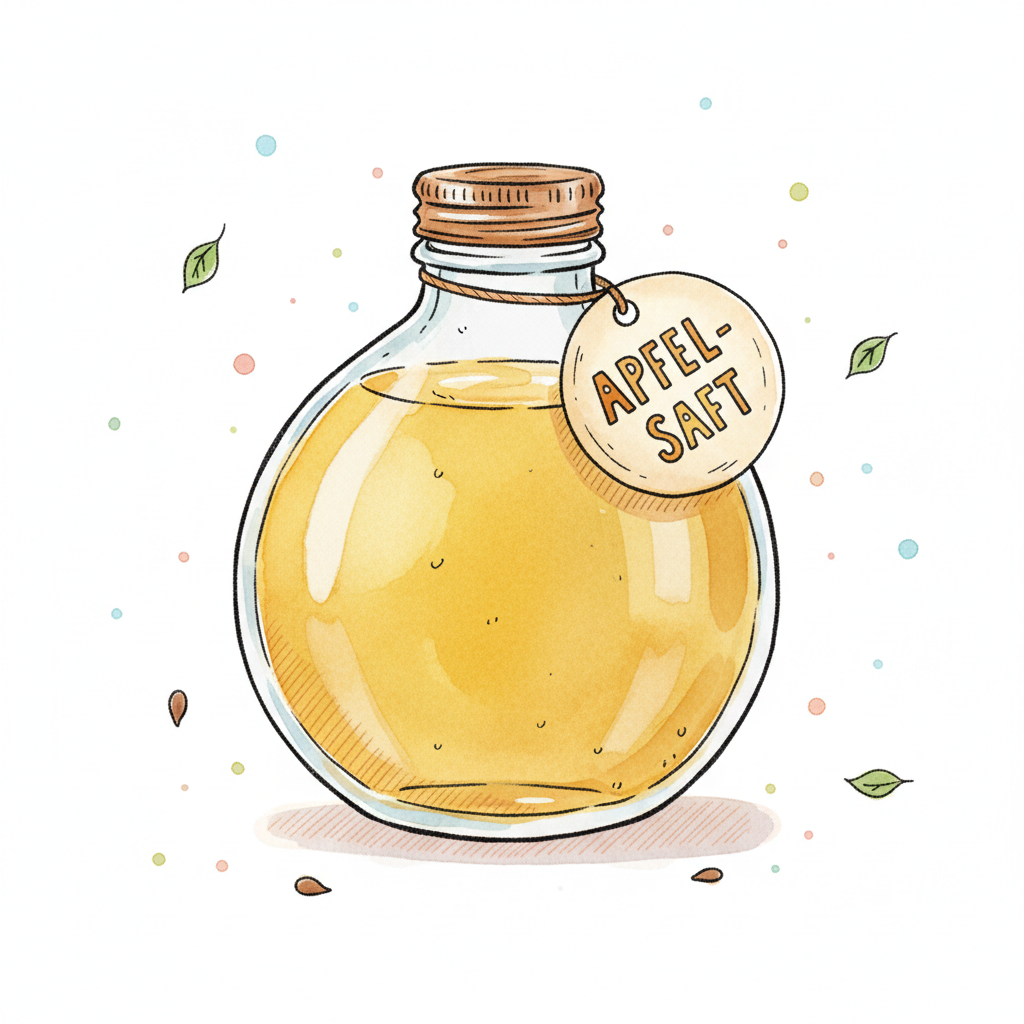 Aquarell-Illustration einer runden Glasflasche mit Apfelsaft und einem Etikett.