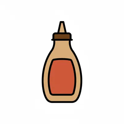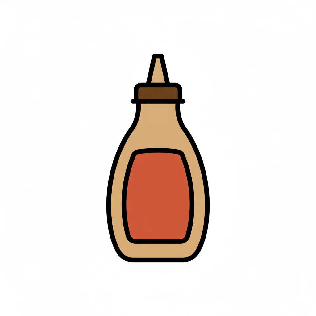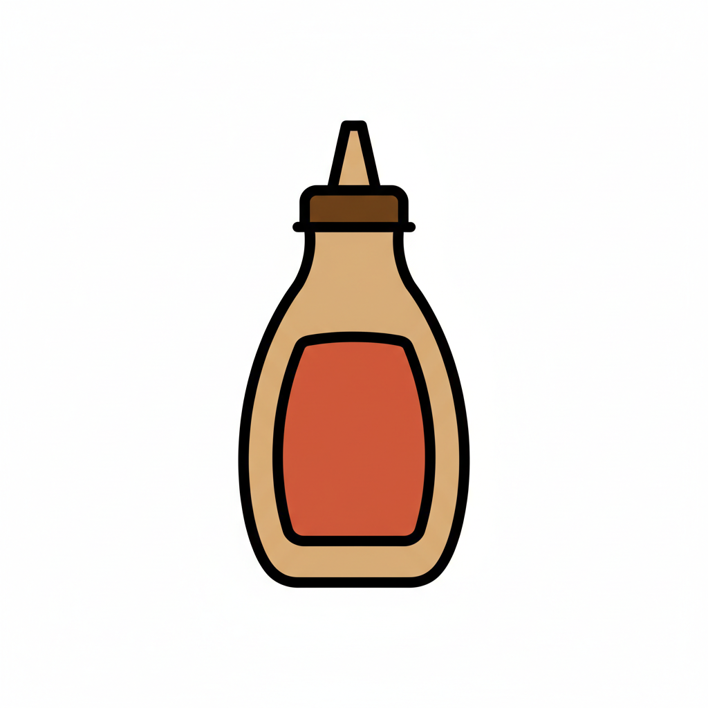 Eine einfache Illustration einer Saucenflasche mit braunem Deckel und rotem Etikett auf weißem Hintergrund.