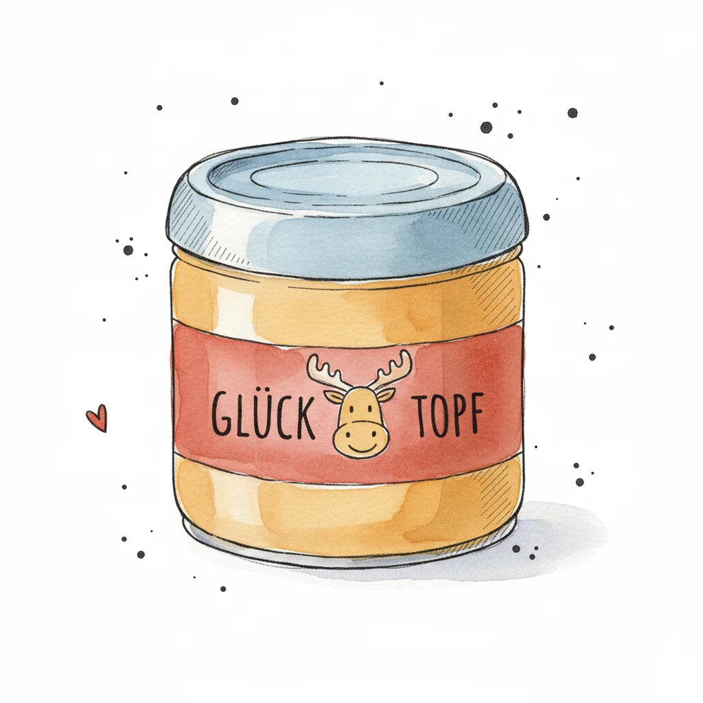 Aquarell-Illustration eines Glases mit 'Glück Topf'-Etikett und lächelndem Elchkopf.