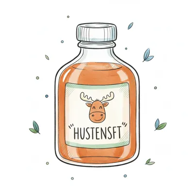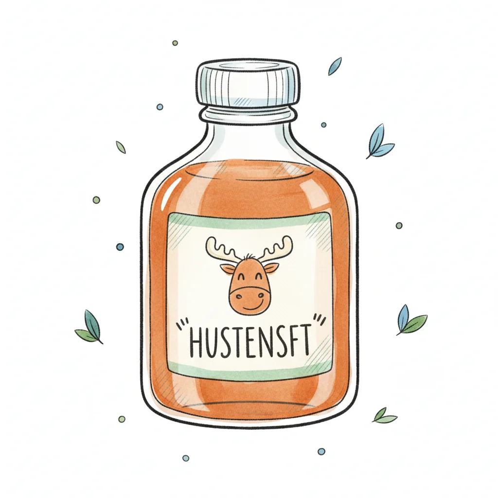 Niedliche Illustration einer Hustensaftflasche mit Elch-Etikett und orangefarbener Flüssigkeit.