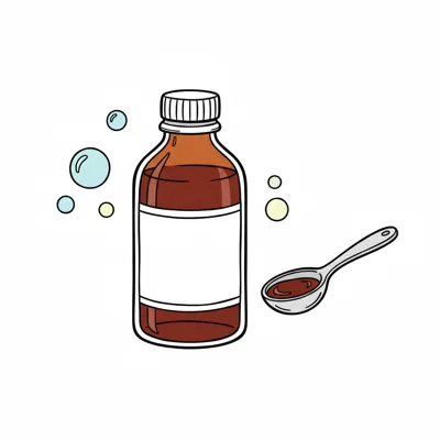 Braune Medizinflasche mit weißem Etikett und Löffel voll Sirup, umgeben von Blasen.