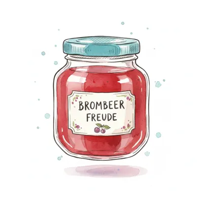Aquarell-Illustration eines Glases Brombeer-Marmelade mit 'Brombeer Freude' Etikett.