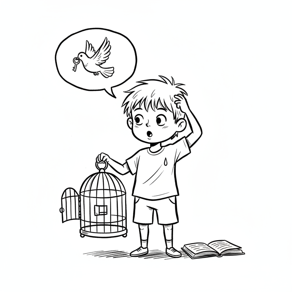 Ein Junge mit einem Käfig denkt an einen fliegenden Vogel.