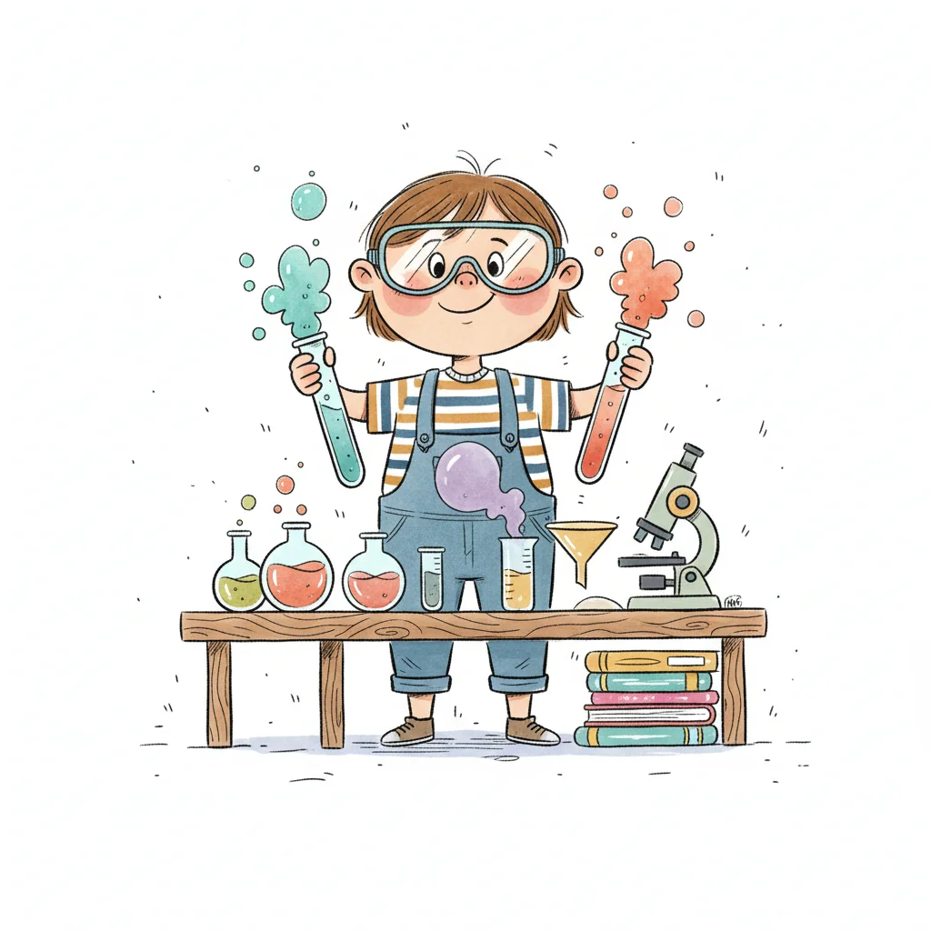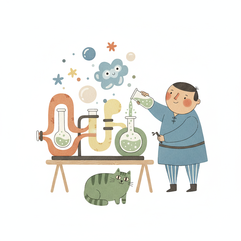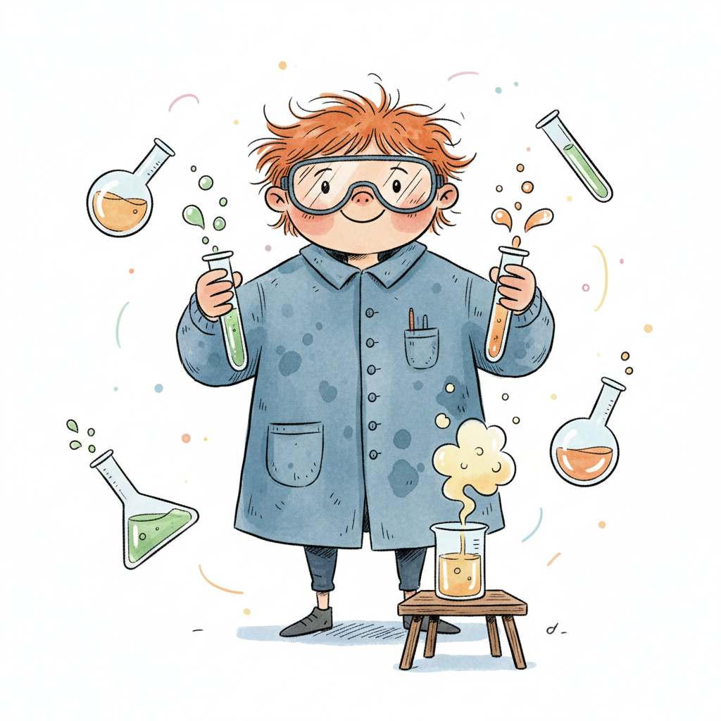 Ein Junge experimentiert mit einer bunten Chemieanlage, während eine Katze zusieht. Blasen und Sterne schweben.