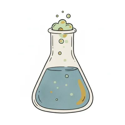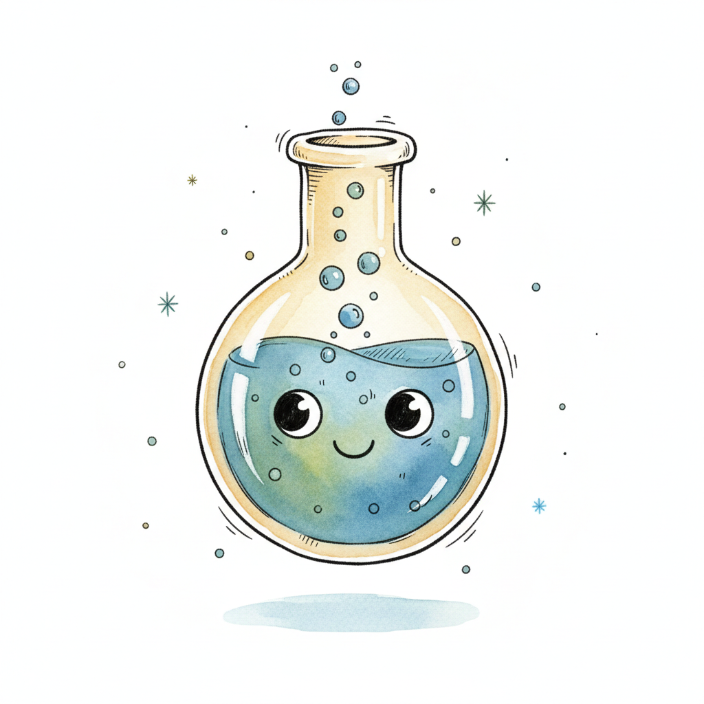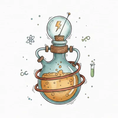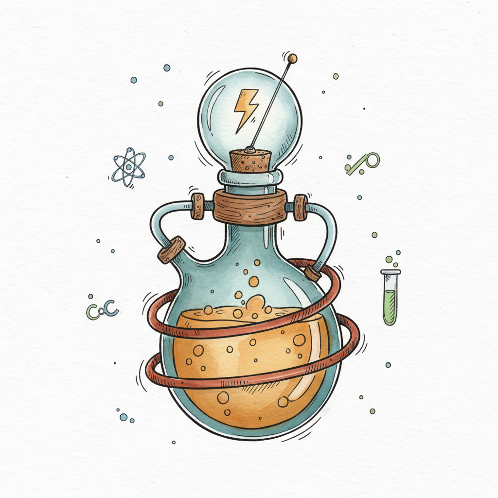 Cartoon-Illustration eines Chemiekolbens mit sprudelnder Flüssigkeit und einer Glühbirne mit Blitzsymbol.