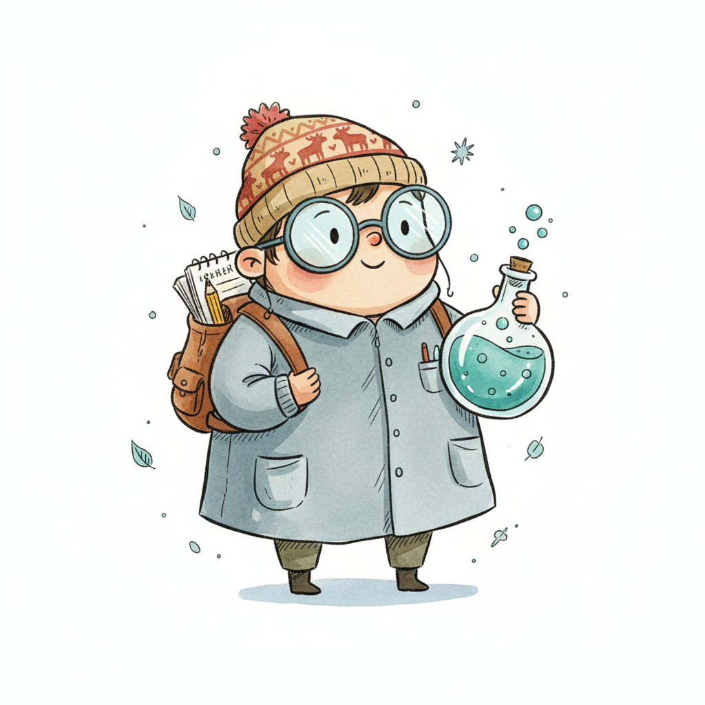 Niedlicher Cartoon-Wissenschaftler mit Mütze, Brille, Laborkittel und Reagenzglas mit blauer Flüssigkeit.