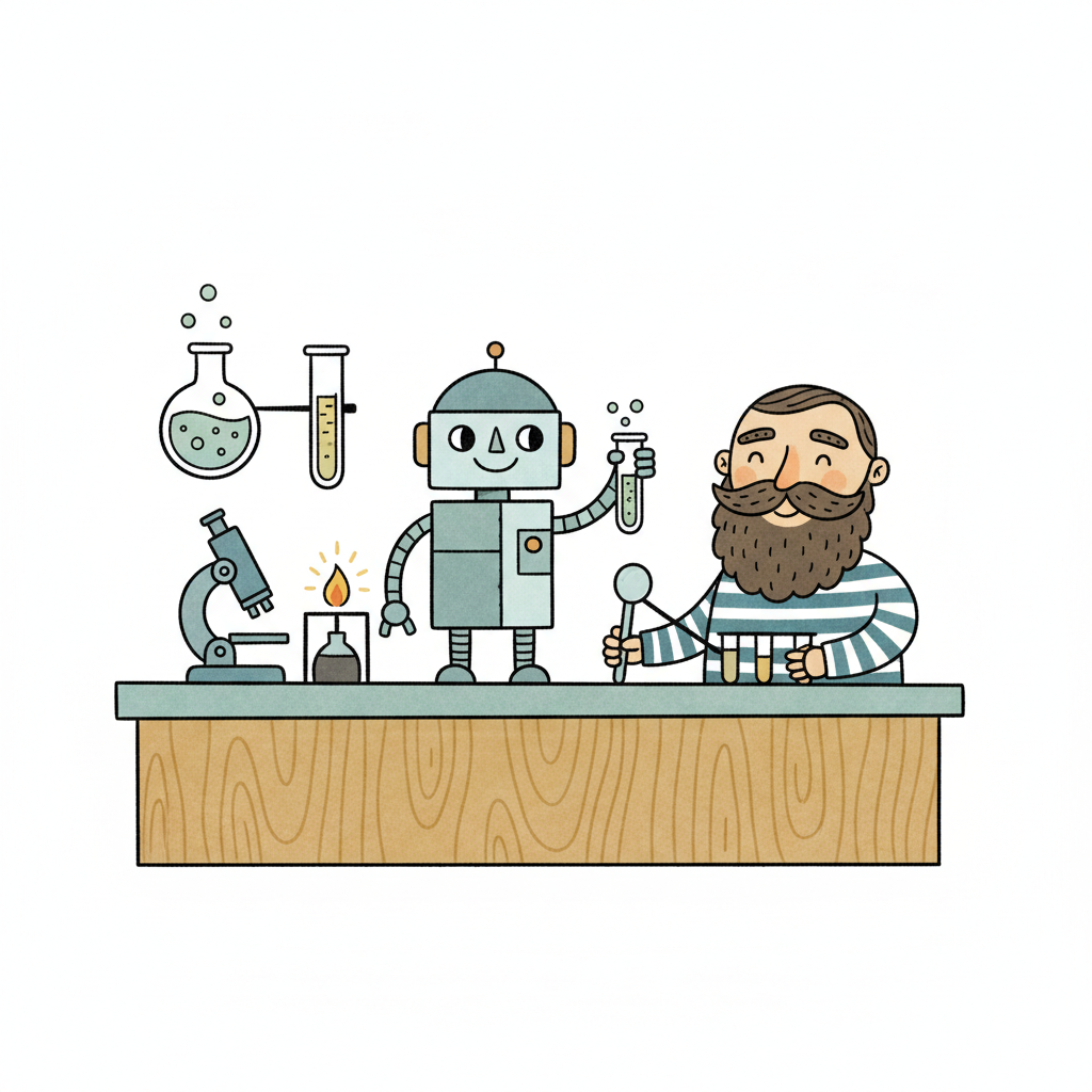 Fröhlicher bärtiger Wissenschaftler und Roboter experimentieren gemeinsam im Labor.