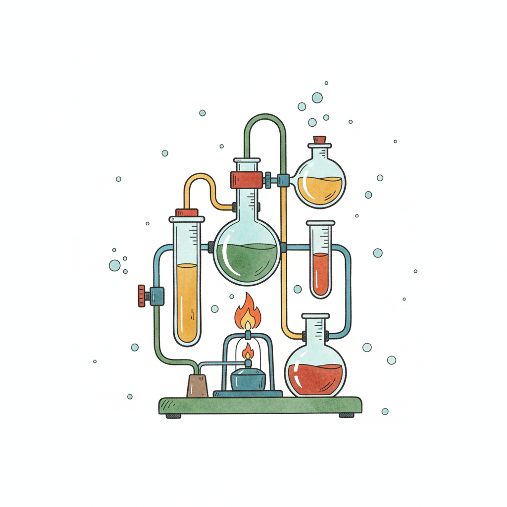 Illustrierte Chemieanlage mit Reagenzgläsern, Kolben, Bunsenbrenner und farbigen Flüssigkeiten.