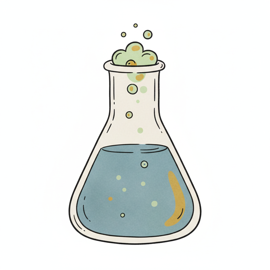 Cartoon-Stil Erlenmeyerkolben mit blauer Flüssigkeit und sprudelndem grünem Schaum.