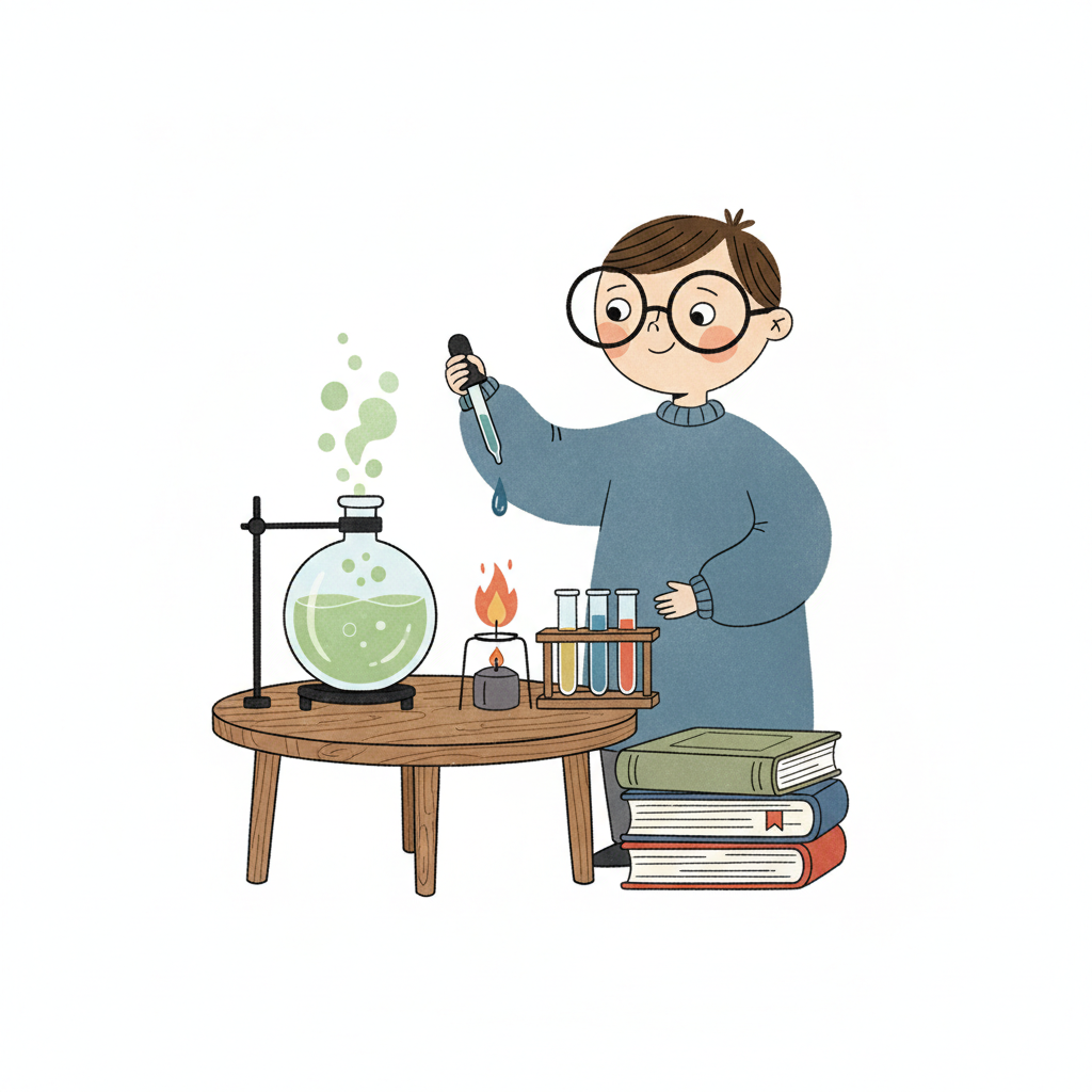 Ein Cartoon-Junge mit Brille macht ein Chemie-Experiment mit Reagenzgläsern, Kolben und Brenner.