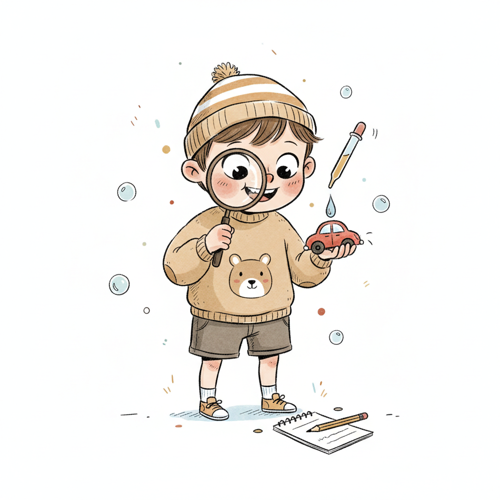 Niedlicher Junge mit Lupe untersucht Spielzeugauto, während Flüssigkeit darauf tropft.