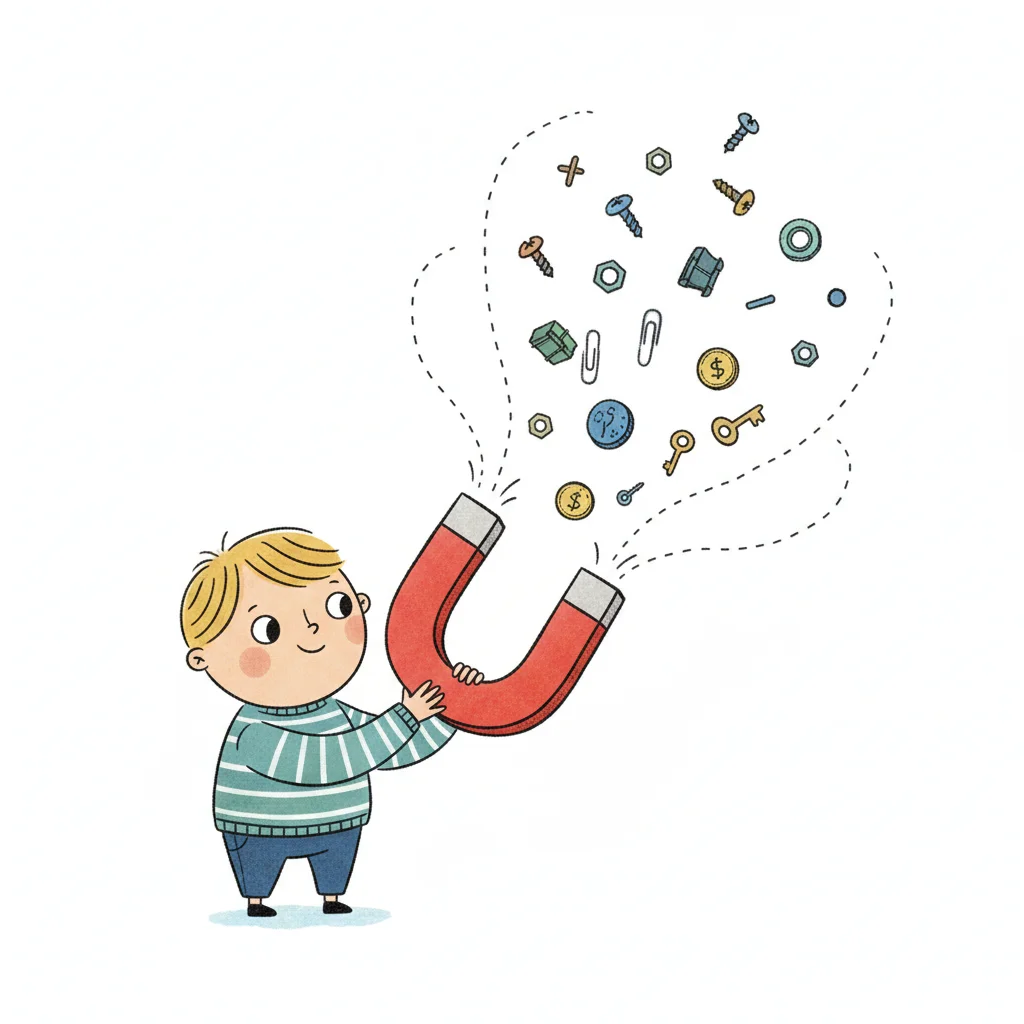 Ein Junge hält einen Magneten, der Metallteile wie Schrauben, Münzen und Schlüssel anzieht.
