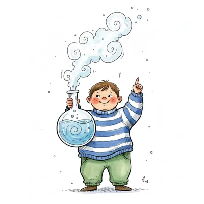 Ein fröhlicher Junge hält einen Kolben mit rauchender Flüssigkeit und zeigt begeistert nach oben.