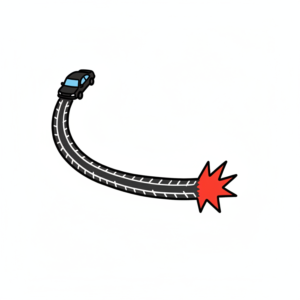 Ein schwarzes Auto fährt auf einer Straße, die abrupt in einer roten Explosion endet.