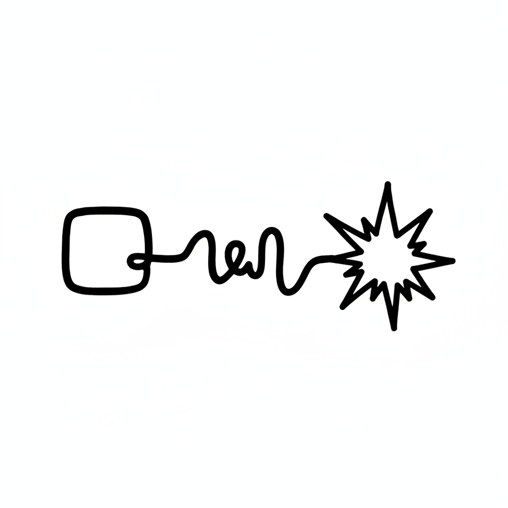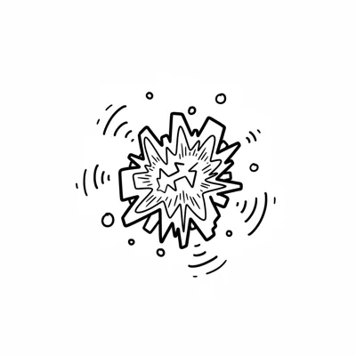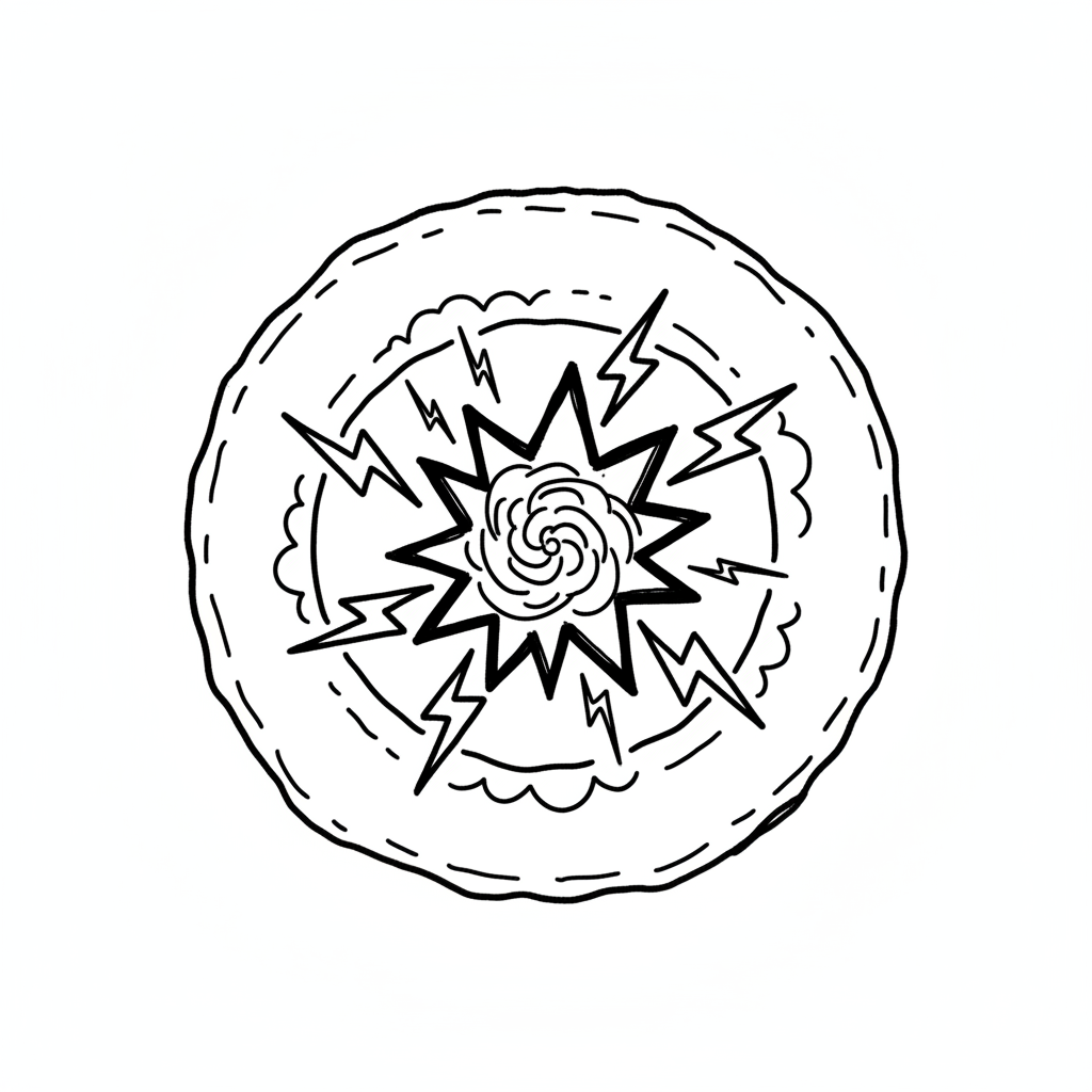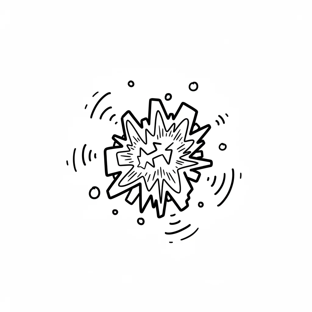 Stilisierte, schwarz-weiße Explosion mit Blitzen und Rauch in einem handgezeichneten Kreis.