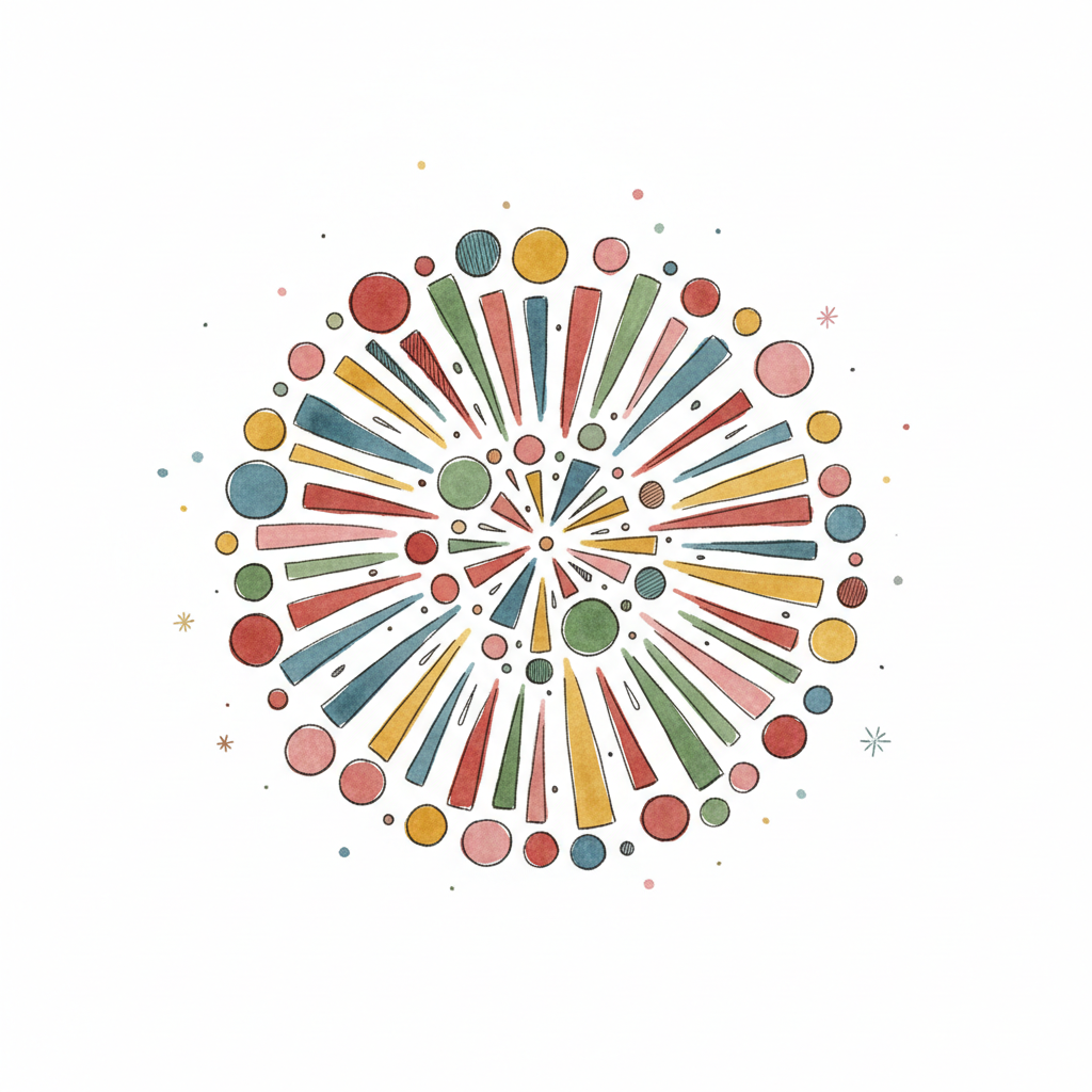 Abstrakte, farbenfrohe Illustration eines Feuerwerks oder einer Explosion aus Kreisen und Strahlen.