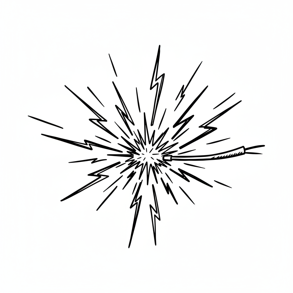 Schwarz-weiße Zeichnung einer elektrischen Explosion oder eines Kurzschlusses mit Funken und einem Kabel.