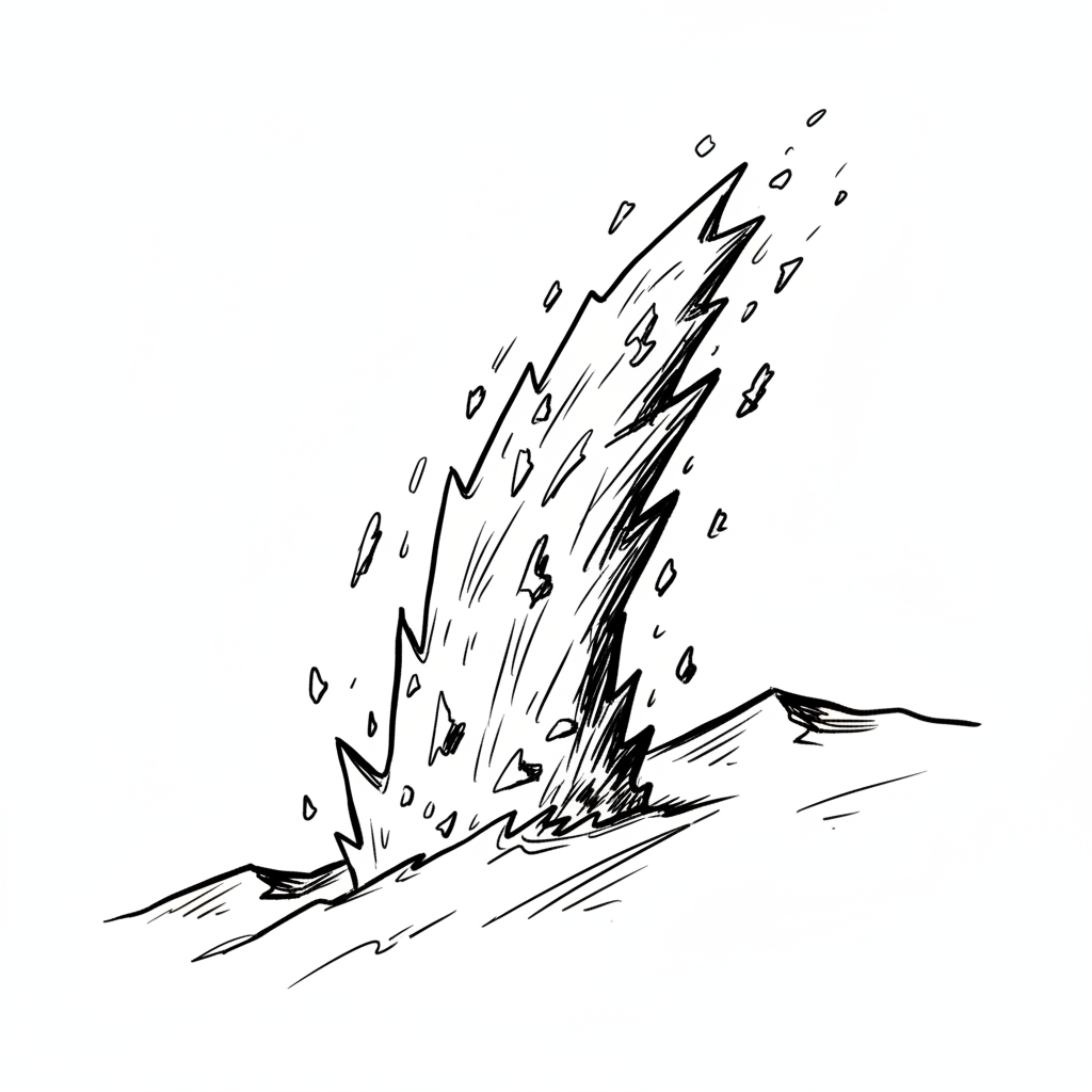 Dynamische Schwarz-Weiß-Zeichnung einer Explosion oder eines Ausbruchs mit fliegenden Fragmenten.