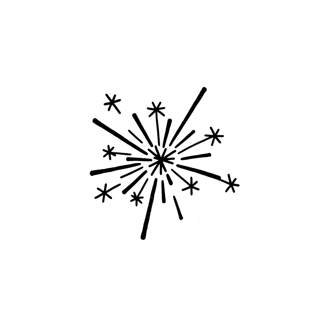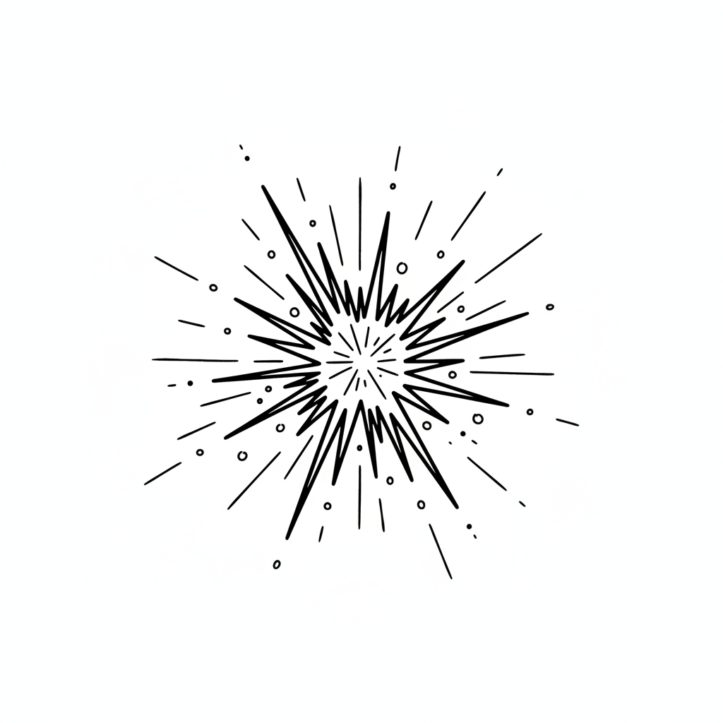Schwarz-weiße Illustration einer Explosion oder eines Feuerwerks mit strahlenden Linien und Sternen.