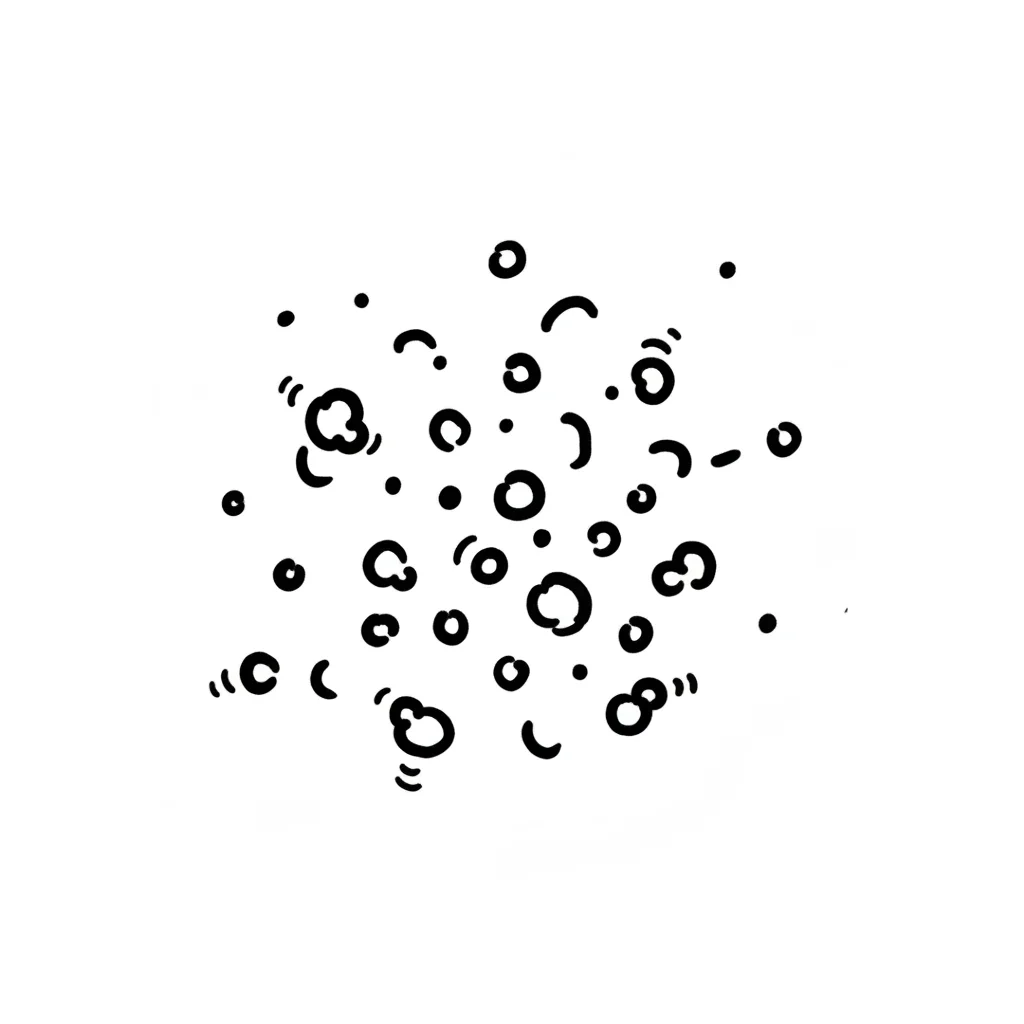 Abstrakte Darstellung einer Explosion oder eines Spritzers mit schwarzen Punkten und Kreisen auf Weiß.