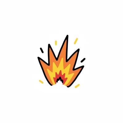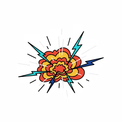 Stilisierte Explosion oder Flamme im Comic-Stil mit leuchtenden Farben und Funken.