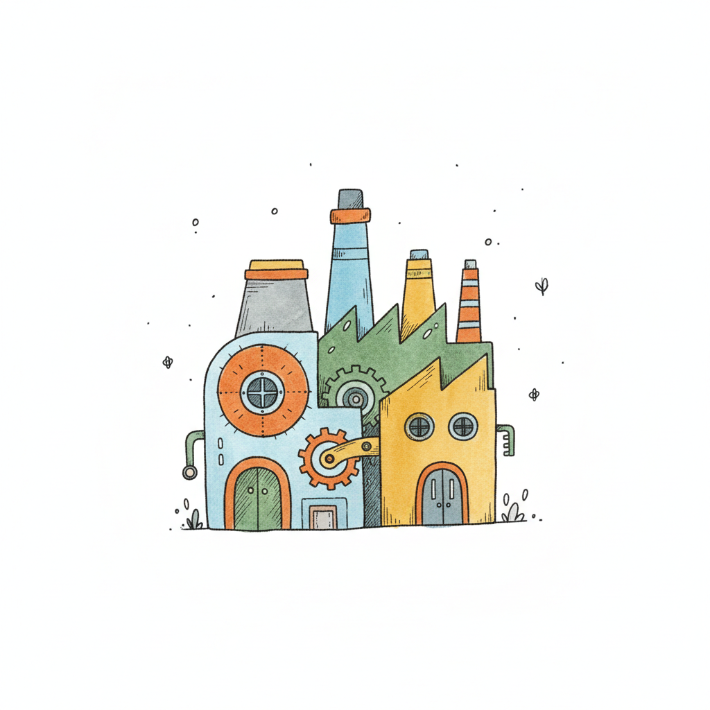 Bunte, cartoonartige Fabrik mit Schornsteinen und Zahnrädern auf weißem Hintergrund.