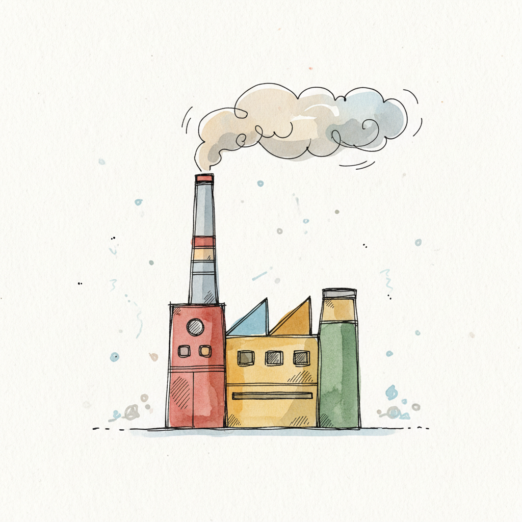 Bunte, skizzierte Fabrik mit rauchendem Schornstein im Aquarellstil.