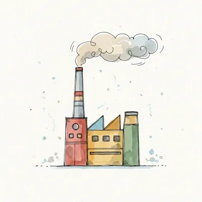 Illustration einer Fabrik mit rauchenden Schornsteinen, einem winkenden Arbeiter und einem Förderband.