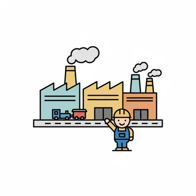 Cartoon: Fabriken mit rauchenden Schornsteinen, Zug und winkendem Arbeiter.