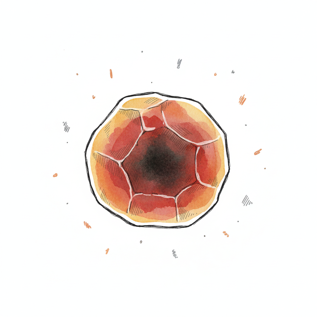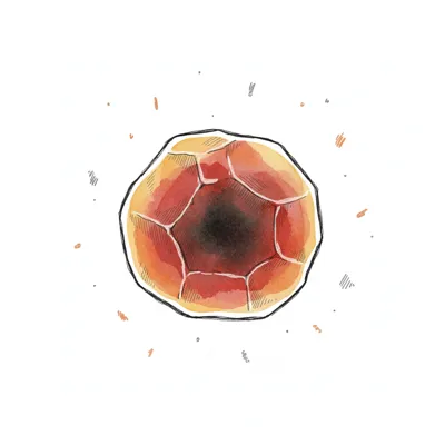 Rötlich-orange, facettierte Kugel mit dunklem Kern, gezeichnet im Aquarellstil.