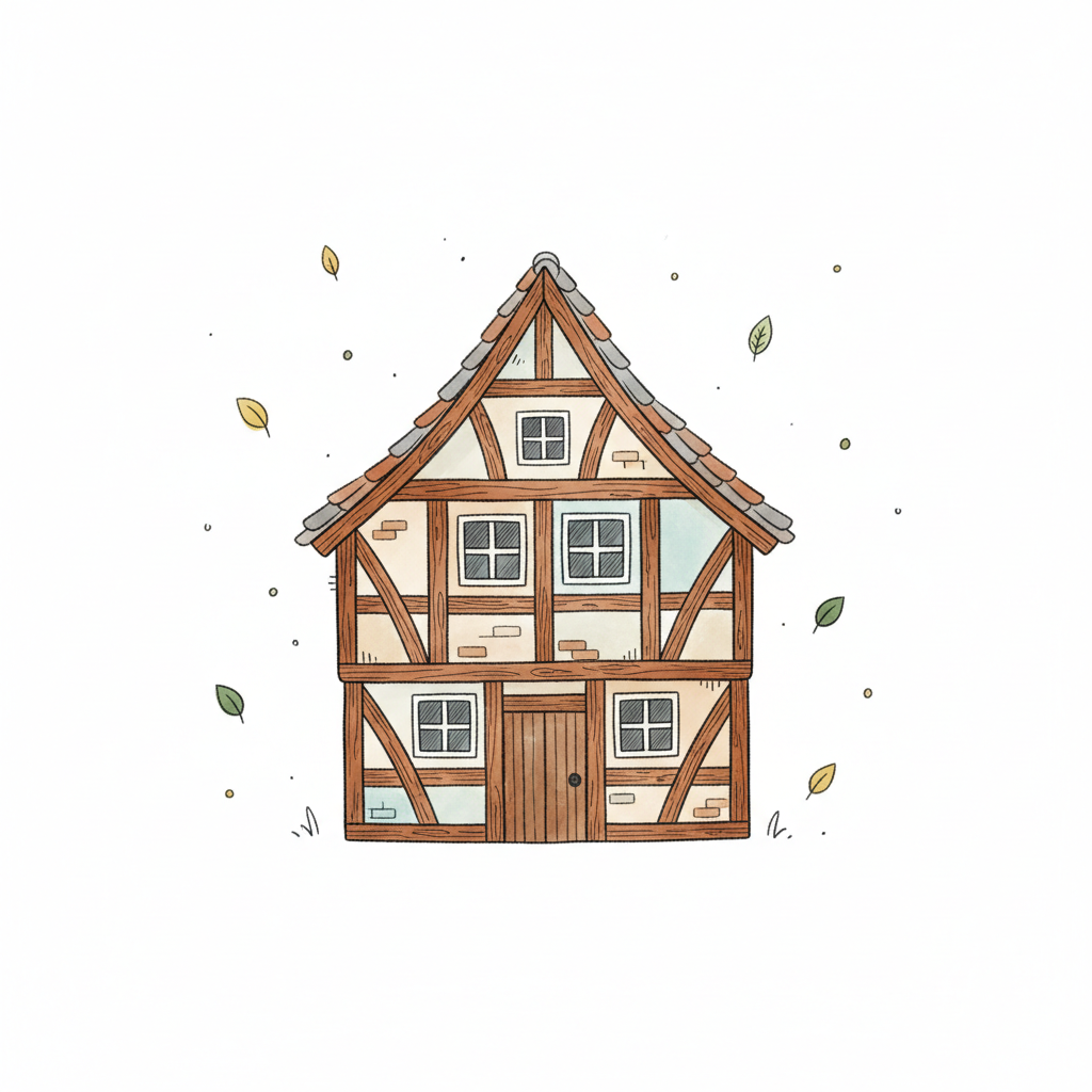 Illustration eines Fachwerkhauses mit rotem Dach, braunen Balken und blauen Fenstern auf weißem Grund.