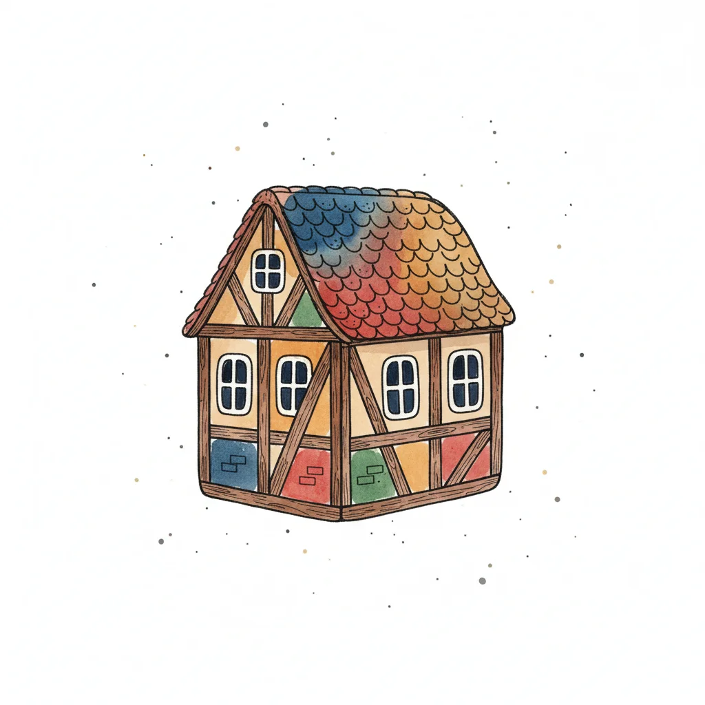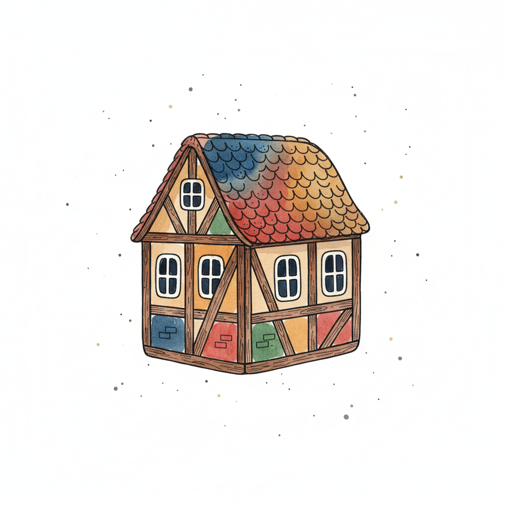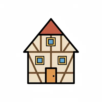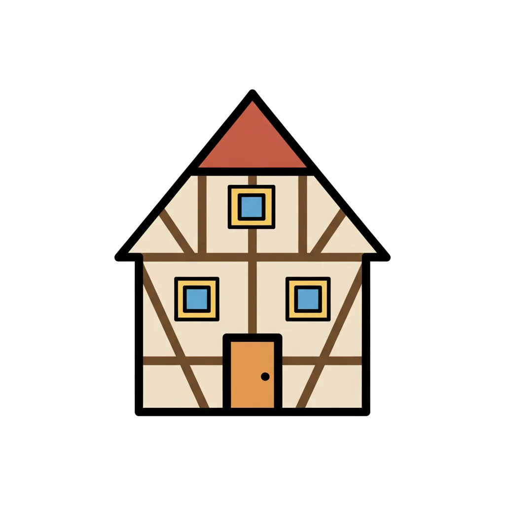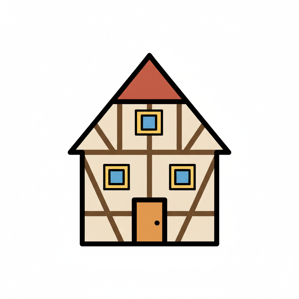 Eine einfache, stilisierte Illustration eines Fachwerkhauses mit rotem Dach und drei Fenstern.