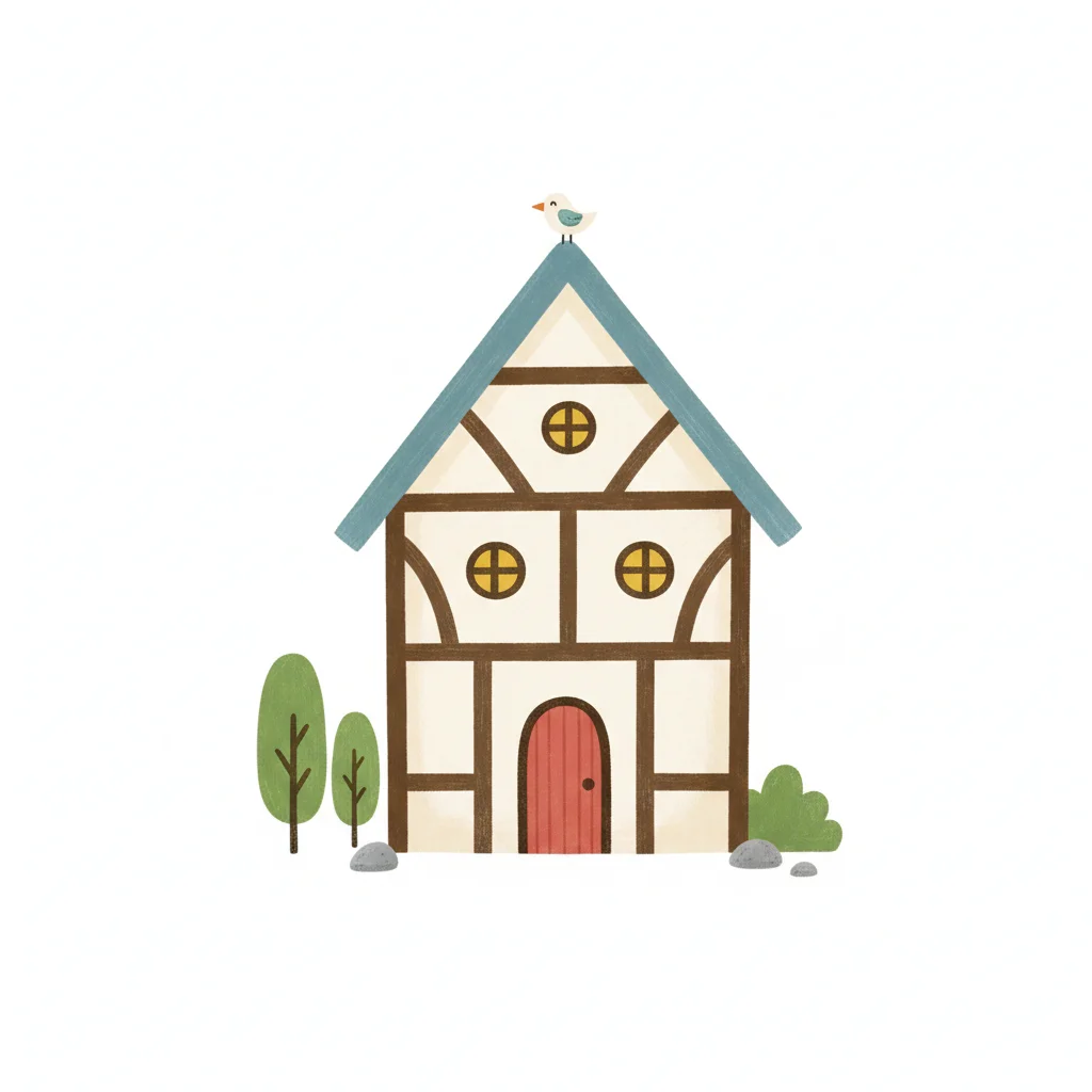 Niedliches Fachwerkhaus-Illustration mit Vogel auf dem Dach, umgeben von Bäumen und Steinen.